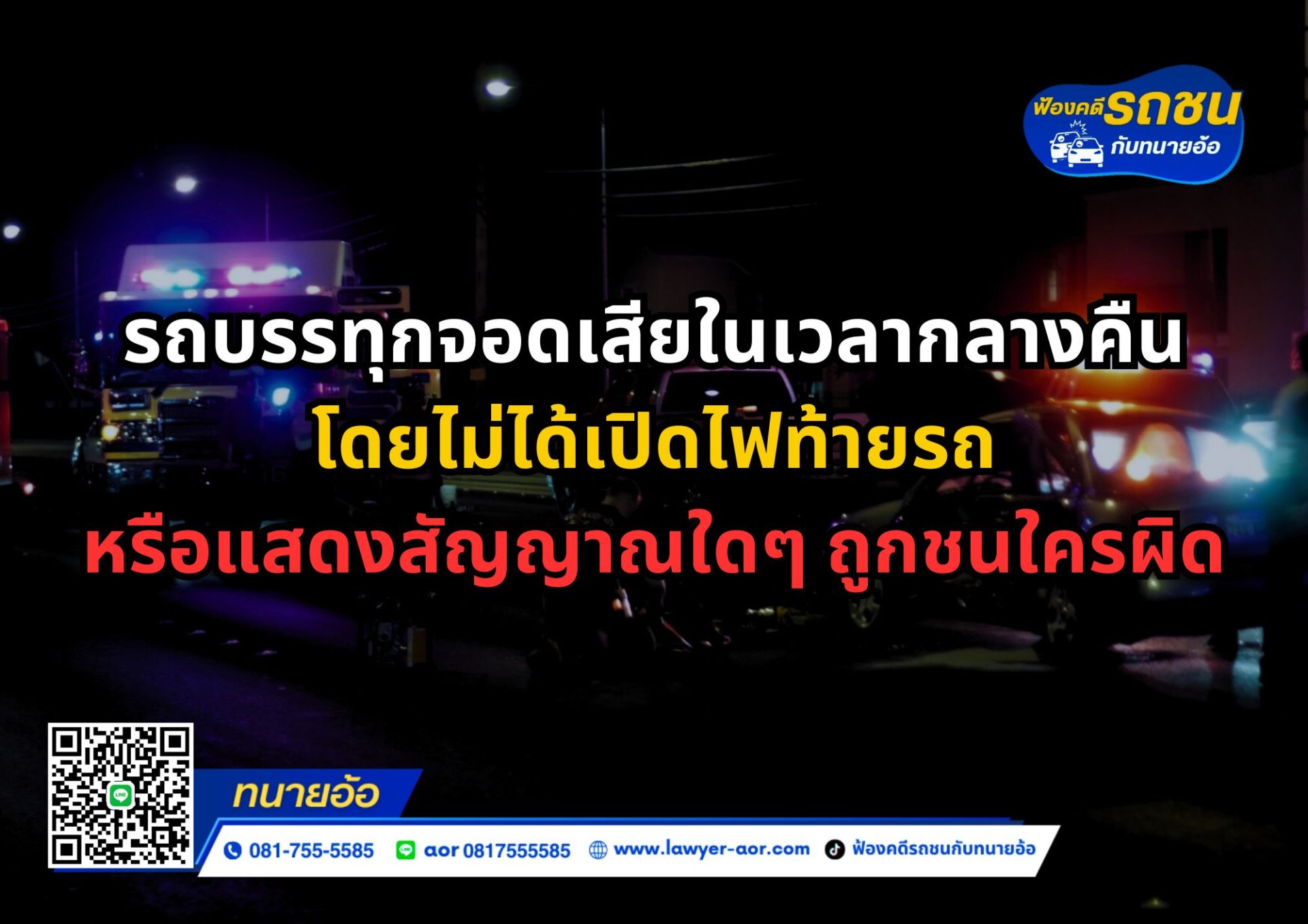 รถบรรทุกจอดเสียในเวลากลางคืน โดยไม่ได้เปิดไฟท้ายรถ หรือแสดงสัญญาณใดๆ ถูกชนใครผิด