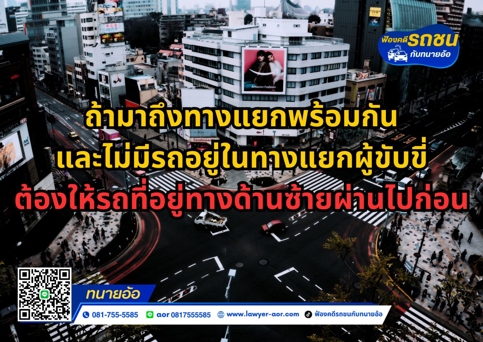 ถ้ามาถึงทางแยกพร้อมกันและ ไม่มีรถอยู่ในทางแยกผู้ขับขี่ ต้องให้รถที่อยู่ทางด้านซ้ายผ่านไปก่อน