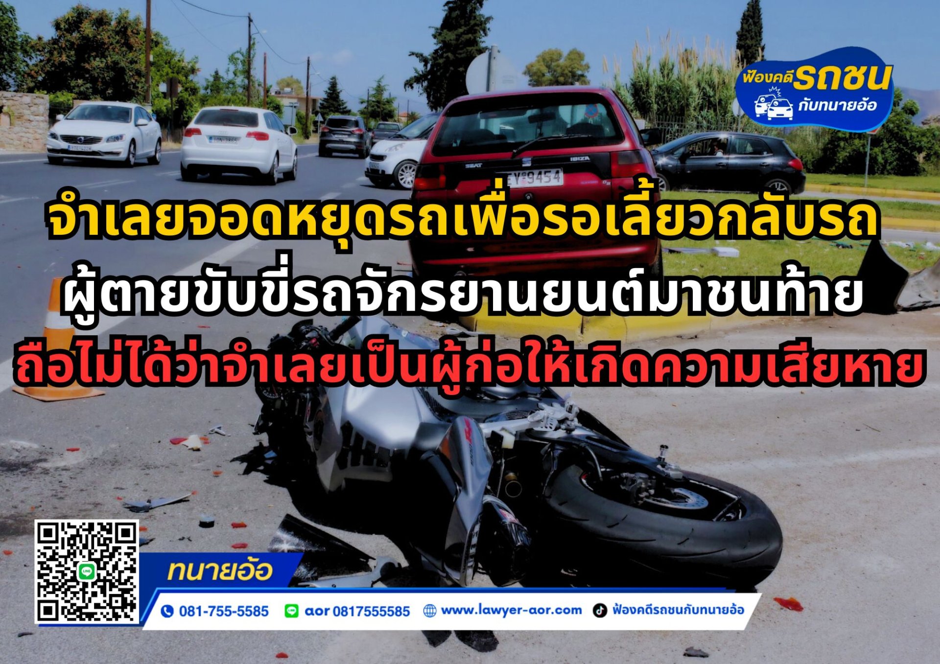 จำเลยจอดหยุดรถเพื่อรอเลี้ยวกลับรถ ผู้ตายขับขี่รถจักรยานยนต์มาชนท้าย ถือไม่ได้ว่าจำเลยเป็นผู้ก่อให้เกิดความเสียหาย
