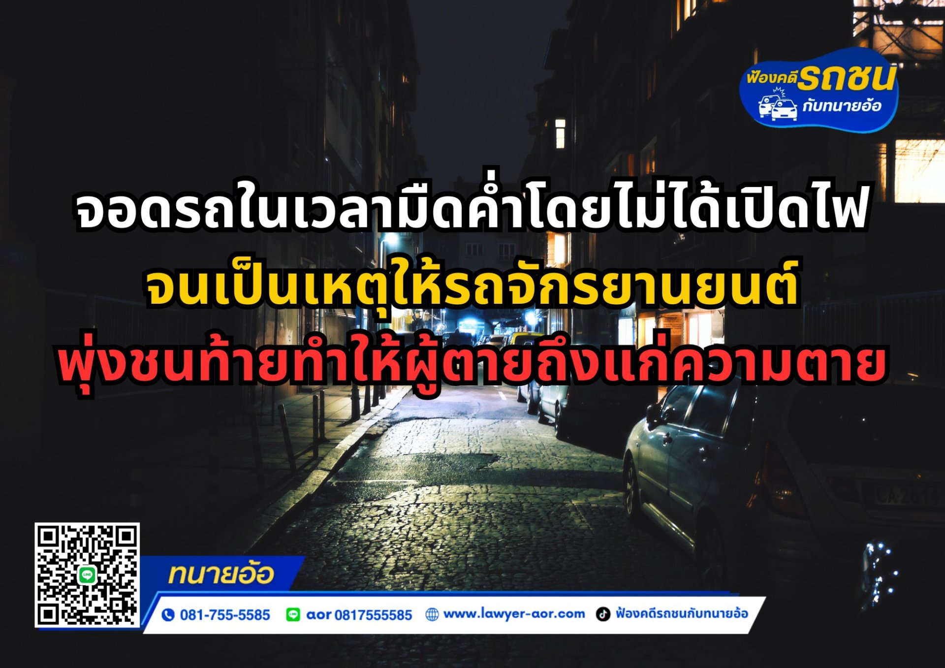 จอดรถในเวลามืดค่ำโดยไม่ได้เปิดไฟ จนเป็นเหตุให้รถจักรยานยนต์ พุ่งชนท้ายทำให้ผู้ตายถึงแก่ความตาย