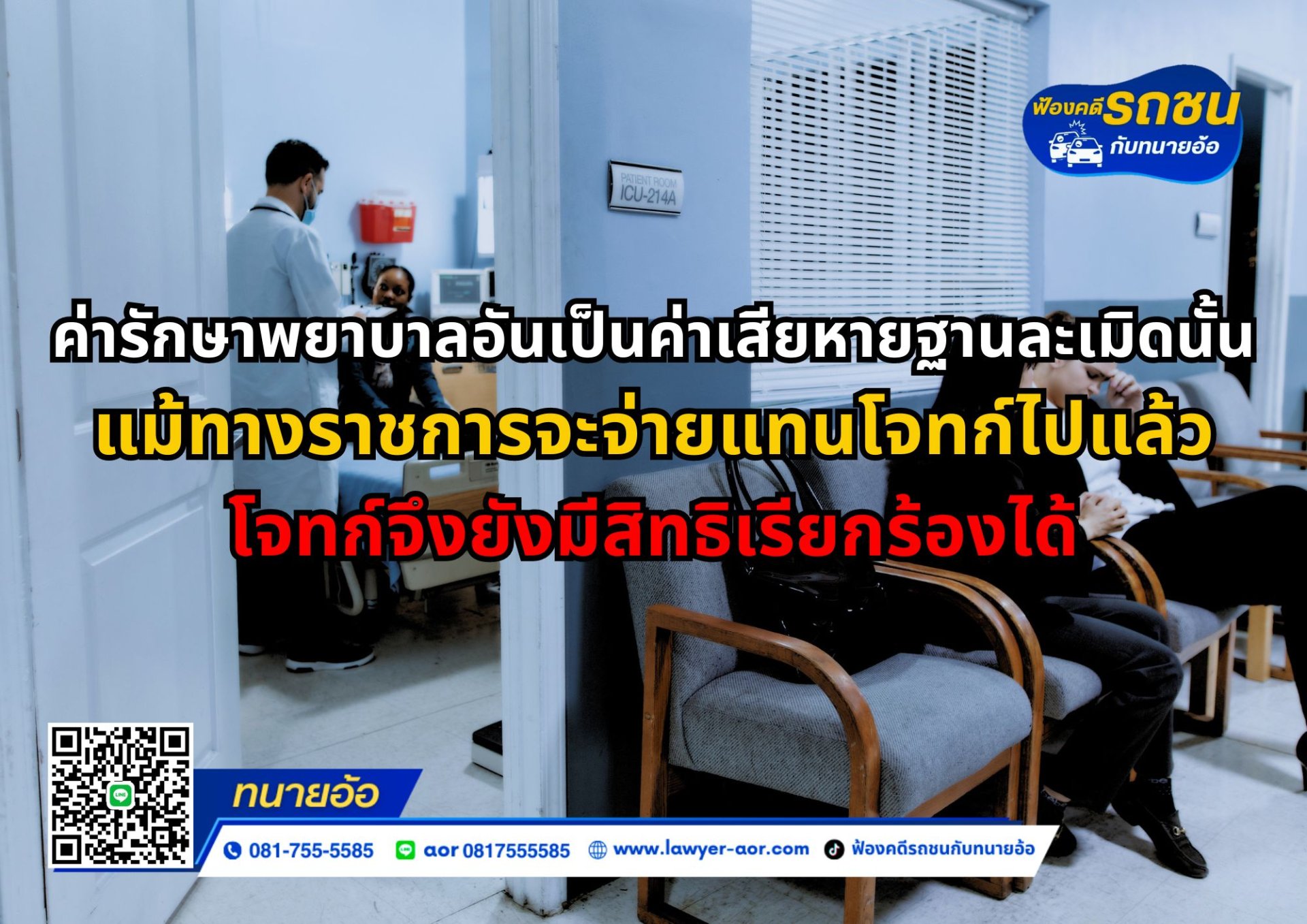 ค่ารักษาพยาบาลอันเป็นค่าเสียหายฐานละเมิดนั้น แม้ทางราชการจะจ่ายแทนโจทก์ไปแล้ว แต่ไม่เกี่ยวกับความรับผิดของจำเลย โจทก์จึงยังมีสิทธิเรียกร้องเอาจากจำเลยผู้ต้องรับผิดฐานละเมิดได้ ตามนัยคำพิพากษาฎีกาที่ 2455/2519 ระหว่าง จ่าสิบเอกประสิทธิ์ กิสศิลป์โจทก์ บริษัทศิริมิตร จำกัด กับพวก จำเลย