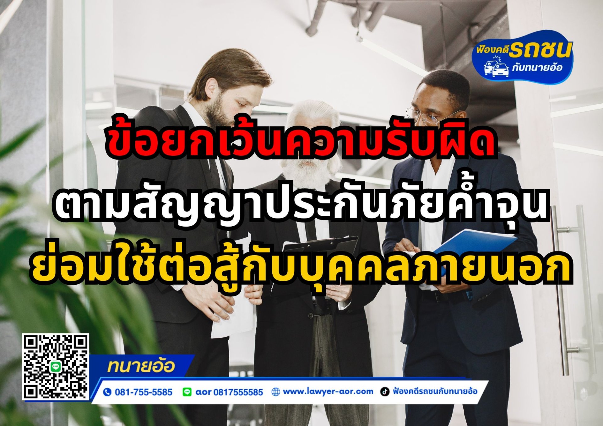 ศาลฎีกาวินิจฉัยว่า "ข้อเท็จจริงเป็นอันยุติตามที่ศาลชั้นต้นได้วินิจฉัยจากพยานหลักฐานในสำนวนว่า จำเลยที่ 2 นำรถยนต์คันเกิดเหตุของจำเลยที่ 2 ไปประกันภัยค้ำจุนไว้กับจำเลยที่ 3เป็นการประกันภัยรถยนต์บรรทุกส่วนบุคคล ตามกรมธรรม์ประกันภัยเอกสารหมาย ล.2 ข้อ 2.11.1 มีข้อยกเว้นความรับผิดต่อบุคคลภายนอกว่าจำเลยที่ 3 ไม่ต้องรับผิดในกรณีการใช้ตามที่ระบุยกเว้นเพิ่มเติมไว้ในตารางตามรายการที่ 7 คือห้ามรับจ้างหรือให้เช่า ขณะเกิดเหตุจำเลยที่ 2 ใช้รถยนต์คันเกิดเหตุไปรับจ้างบรรทุกของโดยให้จำเลยที่ 1 เป็นผู้ขับขี่ แล้วจำเลยที่ 1 ไปทำละเมิดก่อให้เกิดความเสียหายแก่รถยนต์คันที่โจทก์รับประกันภัย จำเลยที่ 1 และที่ 2 ต้องรับผิดใช้ค่าเสียหายให้แก่โจทก์ ปัญหามีว่าจำเลยที่ 3 ผู้รับประกันภัยจะยกข้อยกเว้นความรับผิดต่อบุคคลภายนอกตามสัญญาข้างต้นขึ้นต่อสู้โจทก์ซึ่งเป็นบุคคลภายนอก อันจะมีผลให้จำเลยที่ 3 ไม่ต้องร่วมรับผิดต่อโจทก์ได้หรือไม่ เห็นว่า โจทก์ฟ้อง จำเลยที่ 3 ให้รับผิดใช้ค่าสินไหมทดแทนแก่โจทก์ร่วมกับจำเลยที่ 1 และที่ 2 โดยอาศัยมูลหนี้ตามสัญญาประกันภัยค้ำจุนระหว่างจำเลยที่ 2 กับที่ 3 ความรับผิดของจำเลยที่ 3 ผู้รับประกันภัยที่มีต่อโจทก์จึงต้องเป็นไปตามที่ระบุไว้ในสัญญาดังกล่าว ฉะนั้น จำเลยที่ 3 ย่อมยกข้อยกเว้นความรับผิดต่อบุคคลภายนอกตามสัญญาขึ้นต่อสู้กับโจทก์ได้ เว้นแต่ข้อยกเว้นนั้นจะขัดต่อกฎหมาย ข้อยกเว้นความรับผิดต่อบุคคลภายนอกตามกรมธรรม์ประกันภัยเอกสารหมาย ล.2 ข้อ 2.11.1 ที่กำหนดไว้ว่าจำเลยที่ 3 ไม่ต้องรับผิดในกรณีการใช้ตามที่ระบุยกเว้นเพิ่มเติมไว้ในตารางตามรายการที่ 7 คือ ห้ามรับจ้างหรือให้เช่านั้น ไม่ขัดต่อกฎหมายแต่อย่างใด เพราะเป็นแต่เพียงเงื่อนไขที่กำหนดไว้เพื่อไม่ให้จำเลยที่ 2 ผู้เอาประกันภัยใช้รถยนต์คันเกิดเหตุไปรับจ้างหรือให้เช่าซึ่งเป็นการใช้มากไปกว่าการใช้บรรทุกส่วนบุคคลอันจะทำให้จำเลยที่ 3 ต้องเสี่ยงภัยมากขึ้น ข้อยกเว้นความรับผิดต่อบุคคลภายนอกดังกล่าวจึงใช้บังคับได้ เมื่อข้อเท็จจริงฟังได้ว่าขณะเกิดเหตุ จำเลยที่ 2 ใช้รถยนต์คันเกิดเหตุไปรับจ้างบรรทุกของอันเป็นการผิดเงื่อนไขตามกรมธรรม์ประกันภัย จำเลยที่ 3 จึงไม่ต้องรับผิดต่อจำเลยที่ 2 ตามเงื่อนไขในกรมธรรม์ประกันภัยดังกล่าวและจำเลยที่ 3 มีสิทธิยกขึ้นเป็นข้อต่อสู้โจทก์ได้ จำเลยที่ 3ไม่ต้องรับผิดต่อโจทก์ ฎีกาจำเลยที่ 3 ในปัญหานี้ฟังขึ้นคดีไม่จำต้องวินิจฉัยปัญหาเรื่องค่าเสียหายตามฎีกาจำเลยที่ 3อีกต่อไป"