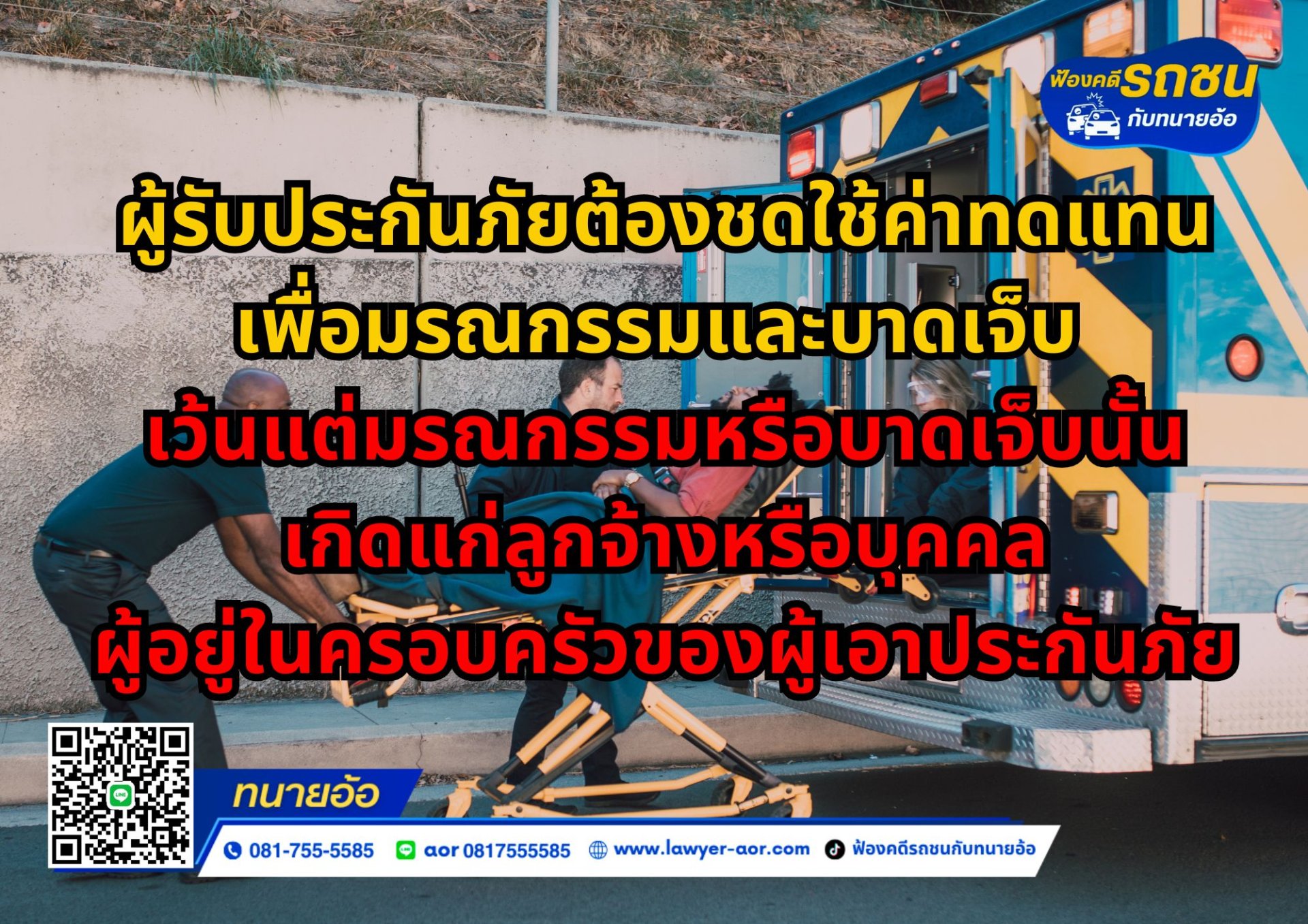 ผู้รับประกันภัยต้องชดใช้ค่าทดแทนเพื่อมรณกรรมและบาดเจ็บ เว้นแต่มรณกรรมหรือบาดเจ็บนั้นเกิดแก่ลูกจ้างหรือบุคคลผู้อยู่ในครอบครัวของผู้เอาประกันภัย